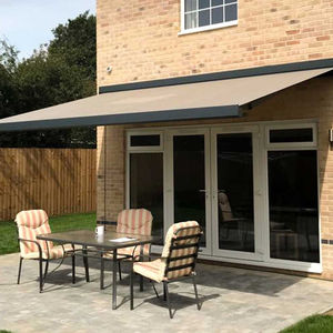 An awning or overhang is a secondary covering attached to the exterior wall of a building. It is typically composed of canvas woven of acrylic, cotton or polyester yarn, or vinyl laminated to polyester fabric that is stretched tightly over a light structure of aluminium, iron or steel, possibly wood or transparent material (used to cover solar thermal panels in the summer, but that must allow as much light as possible in the winter). The configuration of this structure is something of a truss, space frame or planar frame. Awnings are also often constructed of aluminium understucture with aluminium sheeting. These aluminium awnings are often used when a fabric awning is not a practical application where rain load as well as wind loads may be a factor.